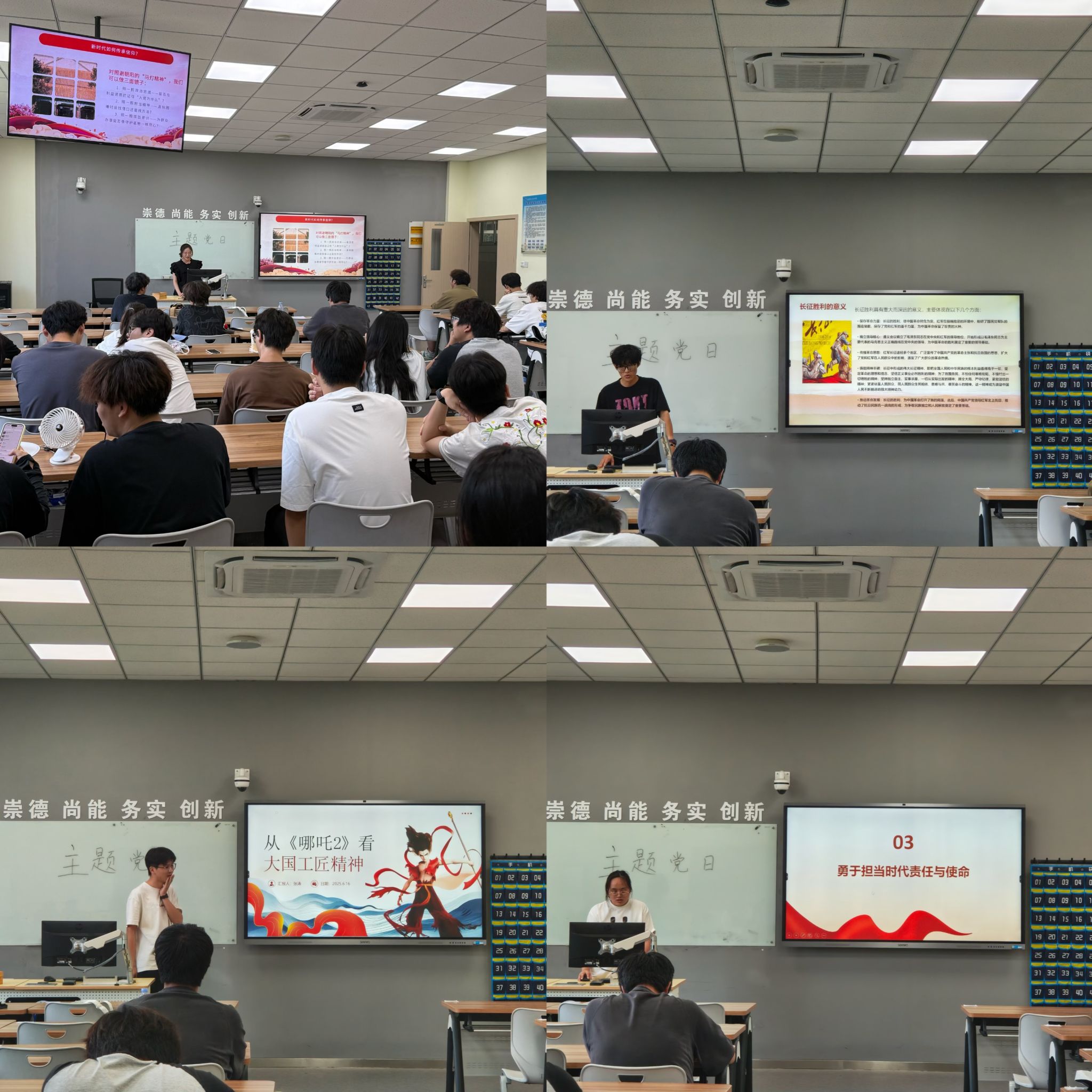 为充分发挥朋辈引领,7名优秀毕业生党员代表走上讲台,以“青春向党·强基铸魂”为题,为入党积极分子们带来了一堂生动而深刻的“最后一课”。毕业生党员结合在校期间的学习、实践经历,分享了自己对党的认识、入党以来的成长感悟,鼓励同学们在未来的学习、工作和生活中,始终保持奋斗精神,将个人理想融入党和国家事业发展大局。党课结束后,全体学生党员集中观看了《党的作风建设的高校实践》微党课。